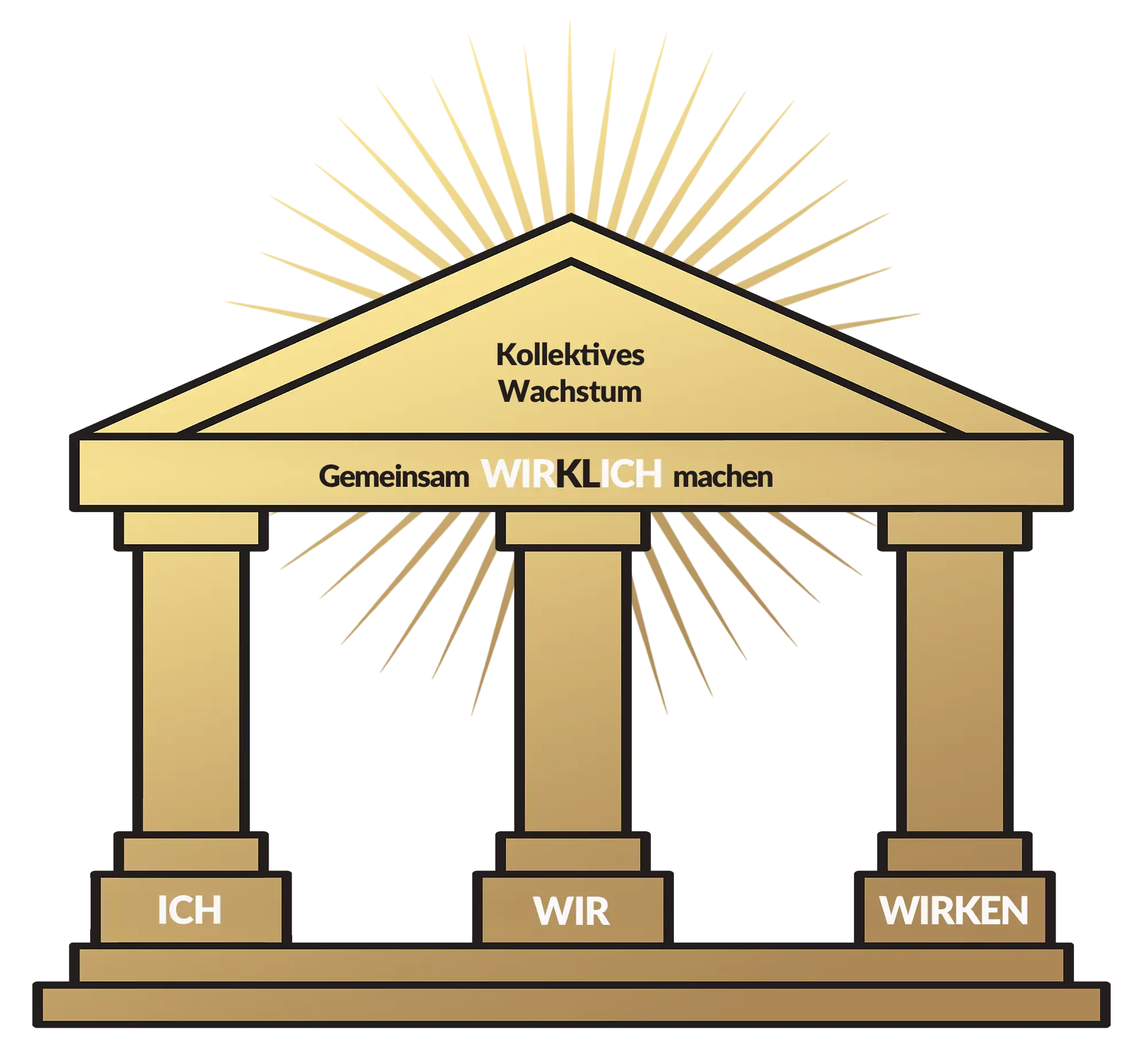 Wirksamkeit ist das Ergebnis von kontinuierlichem Wachstum und beständiger Weiterbildung in starken Feldern von fachkompetenten Gleichgesinnten. Ein klares ICH, genährt von einem echten WIR ist der beste Katalysator für Dein WIRKEN. Die Säulen bedingen und verstärken sich gegenseitig und bringen Dich bestmöglich in das volle Potenzial Deiner Wirksamkeit.